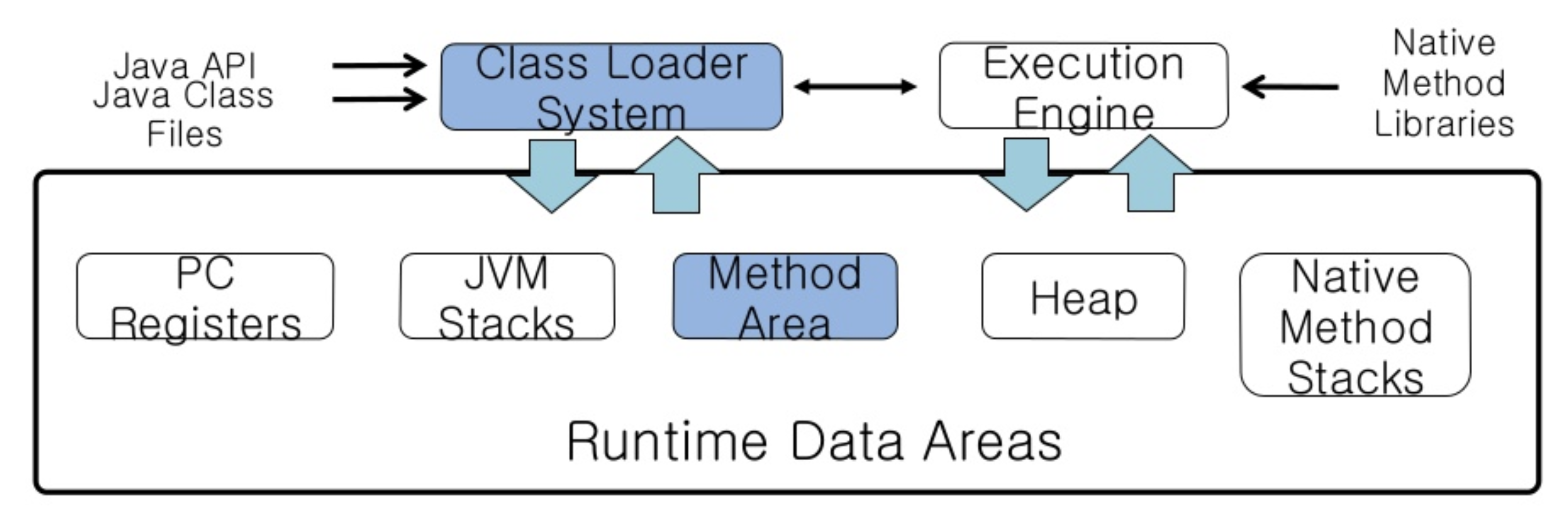 JVM은 Class Loader, Runtime Data Area, Execution Engine, GC 그리고 JNI, Native Method Library로 이루어져 있다.